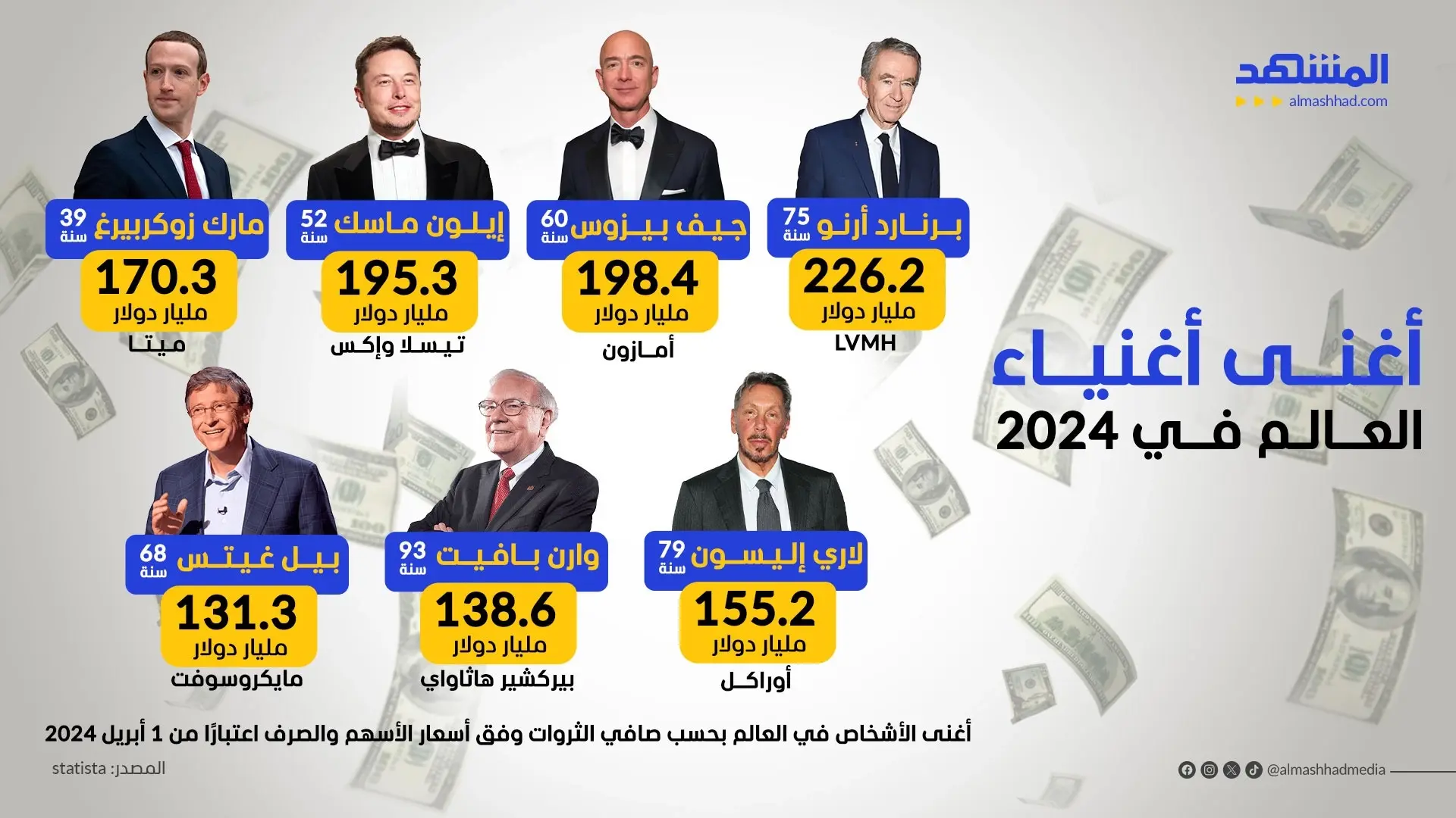 اختير برنارد أرنو (75 عاماً) كأغنى رجل في العالم لعام 2024 بثروة تقدر بـ226.2 مليار دولار، وفقاً لقائمة فوربس السنوية 38 للمليارديرات، التي صدرت يوم الثلاثاء.