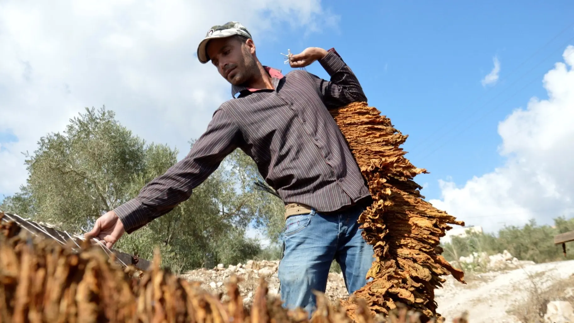 مفيد حسان أحد المزارعين يواظب على العمل بشكل يومي، وعلى تنظيف محيط أشتال التبغ من الأعشاب حتى لا تؤثر في نمو الشتلة، وبعد ذلك يميل لون أوراق التبغ إلى اللون الأصفر في دلالة على نضجها، ثم تبدأ عملية القطاف.