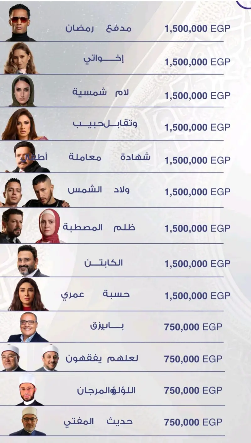 وعن تكاليف الإعلان في مسلسلات رمضان 2025، فتبدأ من مليون جنيه (20 ألف دولار) وتصل 1.5 مليون جنيه (30 ألف دولار) في المسلسلات الآتية (إخواتي – لام شمسية – تقابل حبيب- شهادة معاملة أطفال- ولاد الشمس – ظلم المصطبة – الكابتن – حسبة عمري – الغاوي – كامل العدد – فهد البطل – النص – عايشة الدور – قلبي ومفتاحة – قلبي عندكو – قهوة المحطة – جودر 2 – الأميرة".