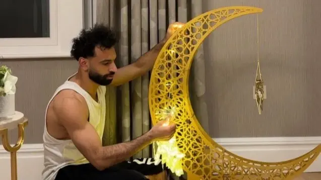 وظهر صلاح عبر خاصية الستوري على صفحته الشخصية في "إنستغرام"، وهو جالس على الأرض، ويقوم بوضع زينة رمضان على شكل هلال بمنزله في ليفربول.