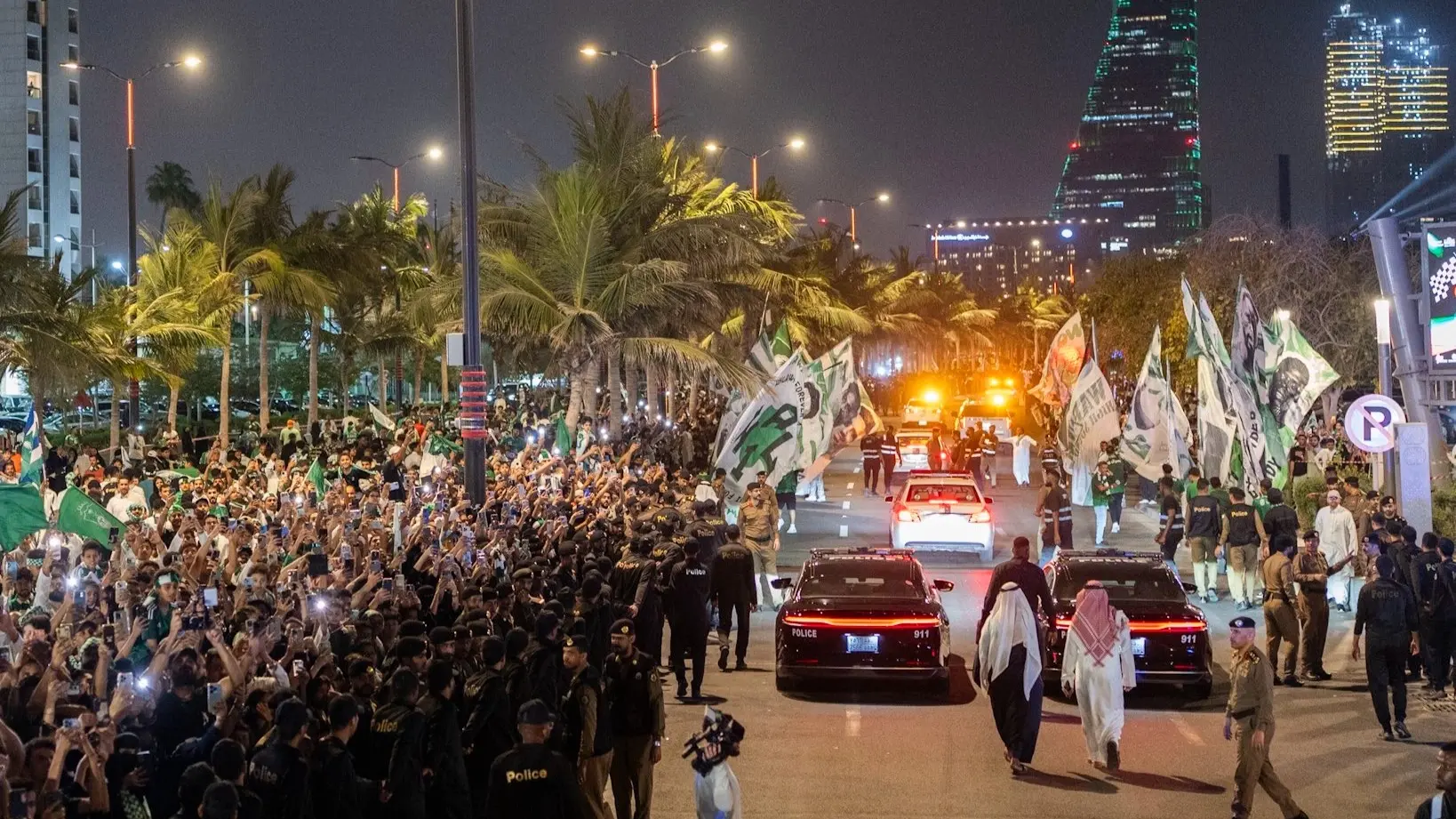 وأوضحت صحيفة "الشرق الأوسط" السعودية أن الحافلة انطلقت من أمام أحد الفنادق الشهيرة على كورنيش جدة في تمام الساعة 8 مساءً بالتوقيت المحلي، لتجوب المدينة في مسار مميز مرورًا بميدان "السفينة" المعروف، وسط حضور جماهيري هائل زين الشوارع بالألعاب النارية والدخان الأخضر والأبيض.