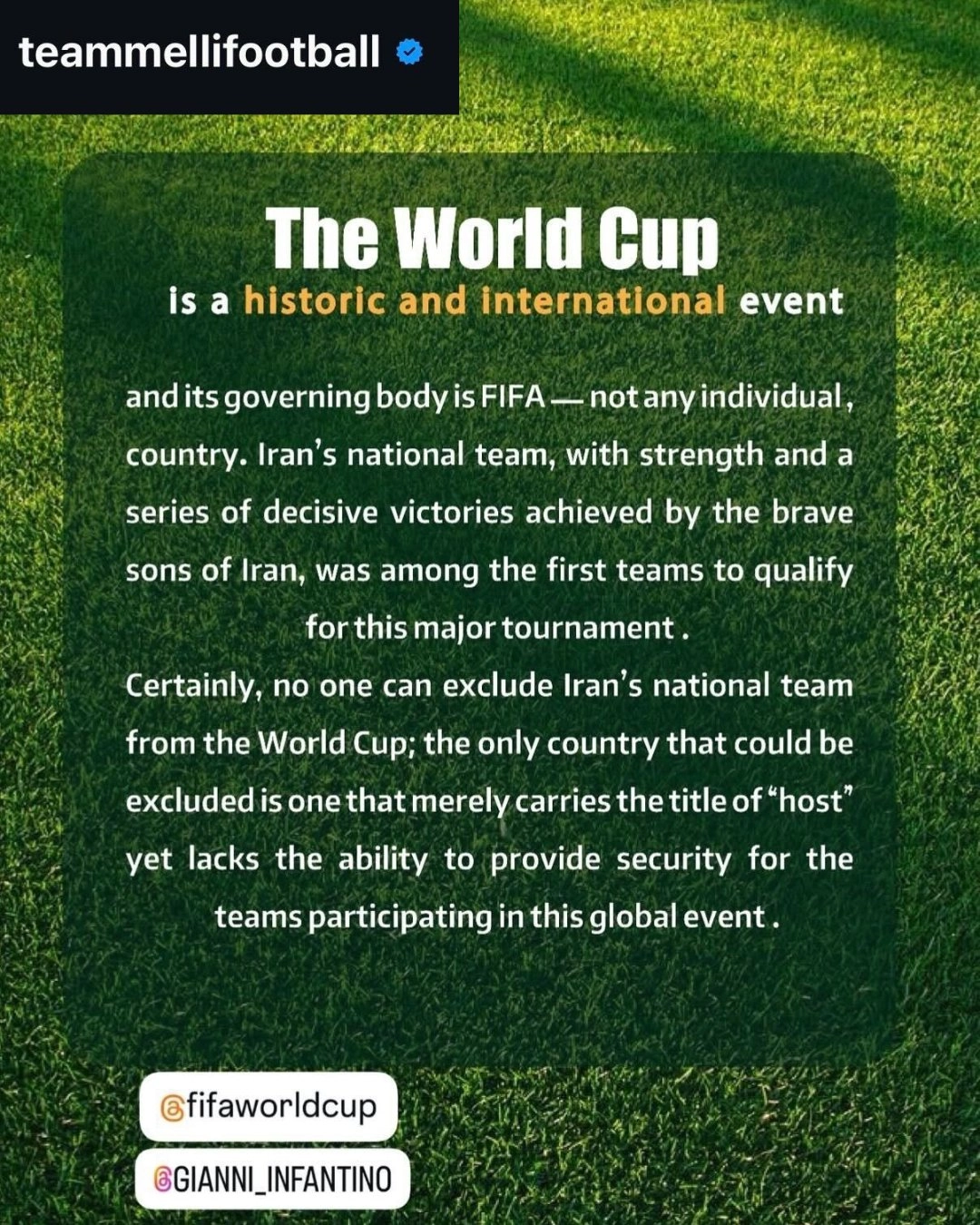 نشر الحساب الرسمي لمنتخب إيران لكرة القدم بيانا عبر منصة "إنستغرام" أكد فيه أن مشاركة الفريق في كأس العالم لا يمكن أن يقررها أي شخص أو دولة.