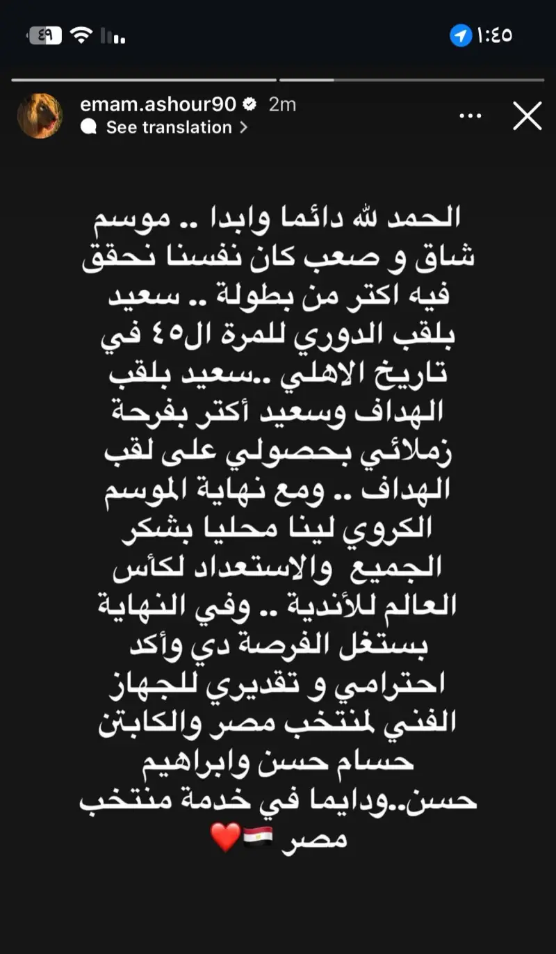 ونشر إمام عاشور عبر حسابه بمنصة "إنستغرام" لتبادل الصور، رسالة قدم من خلالها التهنئة لجماهير الأهلي بعد التتويج بلقب الدوري للمرة الـ45 في تاريخ النادي، كما أكد على تقديره واحترامه للجهاز الفني لمنتخب مصر بقيادة حسام وابراهيم حسن.