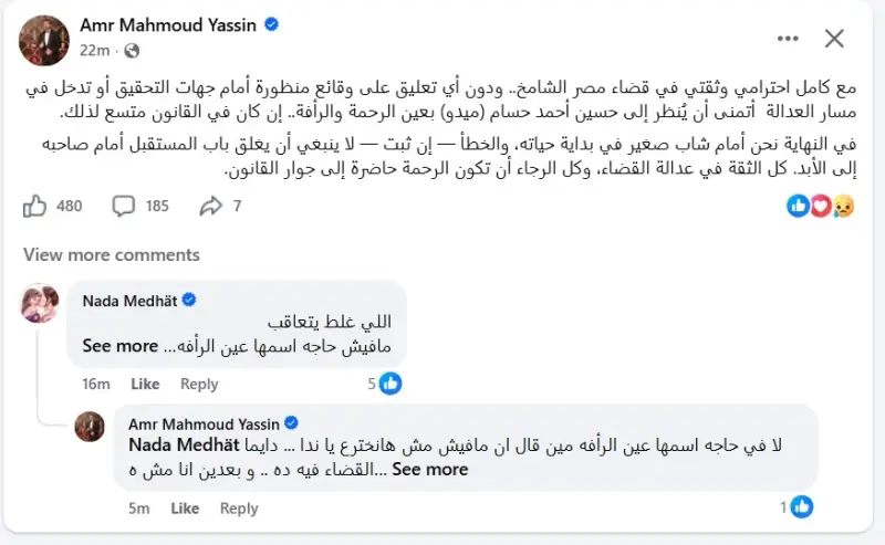 ودعا عمرو محمود ياسين في منشوره إلى النظر إلى حسين أحمد حسام ميدو بعين الرحمة والرأفة. وجاء موقف عمرو محمود ياسين ضمن حالة من الجدل الدائر حول القضية، إذ أوضح أن أي خطأ محتمل لا ينبغي أن يتحول إلى نهاية الطريق أمام شاب ما زال في مرحلة التكوين، مع التأكيد على أن العدالة يمكن أن تتسع في الوقت نفسه لمراعاة البعد الإنساني.