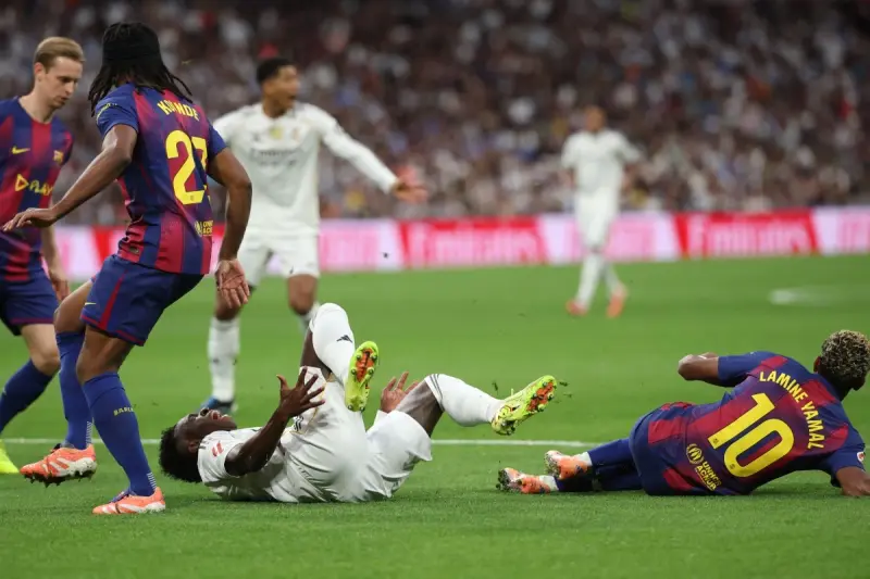 في كلاسيكو مشحون بالأحداث من لحظاته الأولى، سرعان ما تحوّل الحديث من الأداء الفني إلى الجدل التحكيمي، بعد لقطة مثيرة في الدقائق الأولى من المباراة بين ريال مدريد وبرشلونة على ملعب "سانتياغو برنابيو"، حين طالب لاعبو النادي الملكي بركلة جزاء لصالح البرازيلي فينيسيوس جونيور، قبل أن يتراجع الحكم عن قراره بعد تدخل تقنية الفيديو (فار).