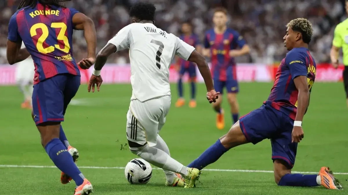 بعد مرور دقيقتين فقط على انطلاق اللقاء، كاد فينيسيوس جونيور أن يفتتح التسجيل لصالح ريال مدريد حين انطلق بسرعته المعهودة داخل منطقة الجزاء متجاوزًا أكثر من لاعب من صفوف برشلونة، قبل أن يتدخل الجناح الشاب لامين يامال في لحظة حاسمة ليمنع تسديدته.