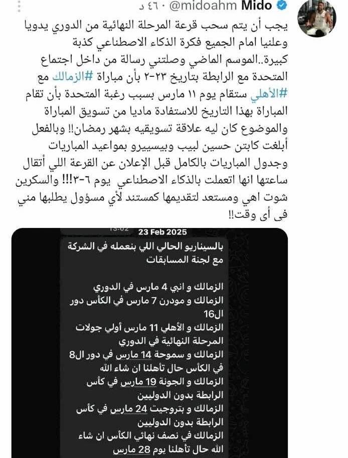 أثارت تغريدة نشرها أحمد حسام ميدو، نجم الزمالك ومنتخب مصر السابق وعضو اللجنة الفنية السابق بالنادي الأبيض، حالة واسعة من الجدل قبل ساعات من مراسم سحب قرعة المرحلة الـ2 من الدوري المصري الممتاز، قبل أن يقوم بحذفها لاحقا من حسابه على منصة "إكس".