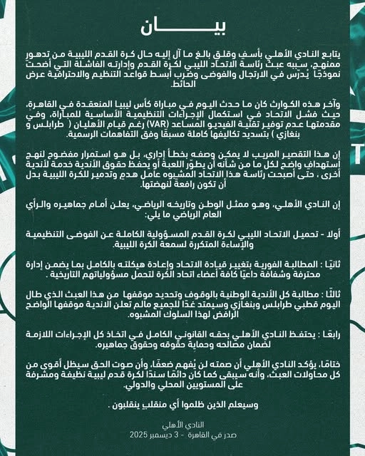 وأكد بطل الدوري الليبي مطالبته الفورية بتجديد قيادات الاتحاد، مع الاحتفاظ بكامل حقوقه القانونية بعد ما حدث اليوم.