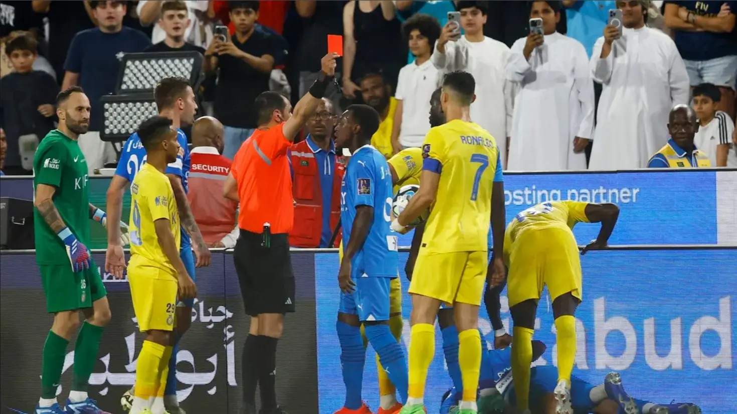 وأشهر الحكم محمد الهويش البطاقة الحمراء في وجه رونالدو، إثر تعدّيه بدون كرة على مدافع الهلال علي البليهي.