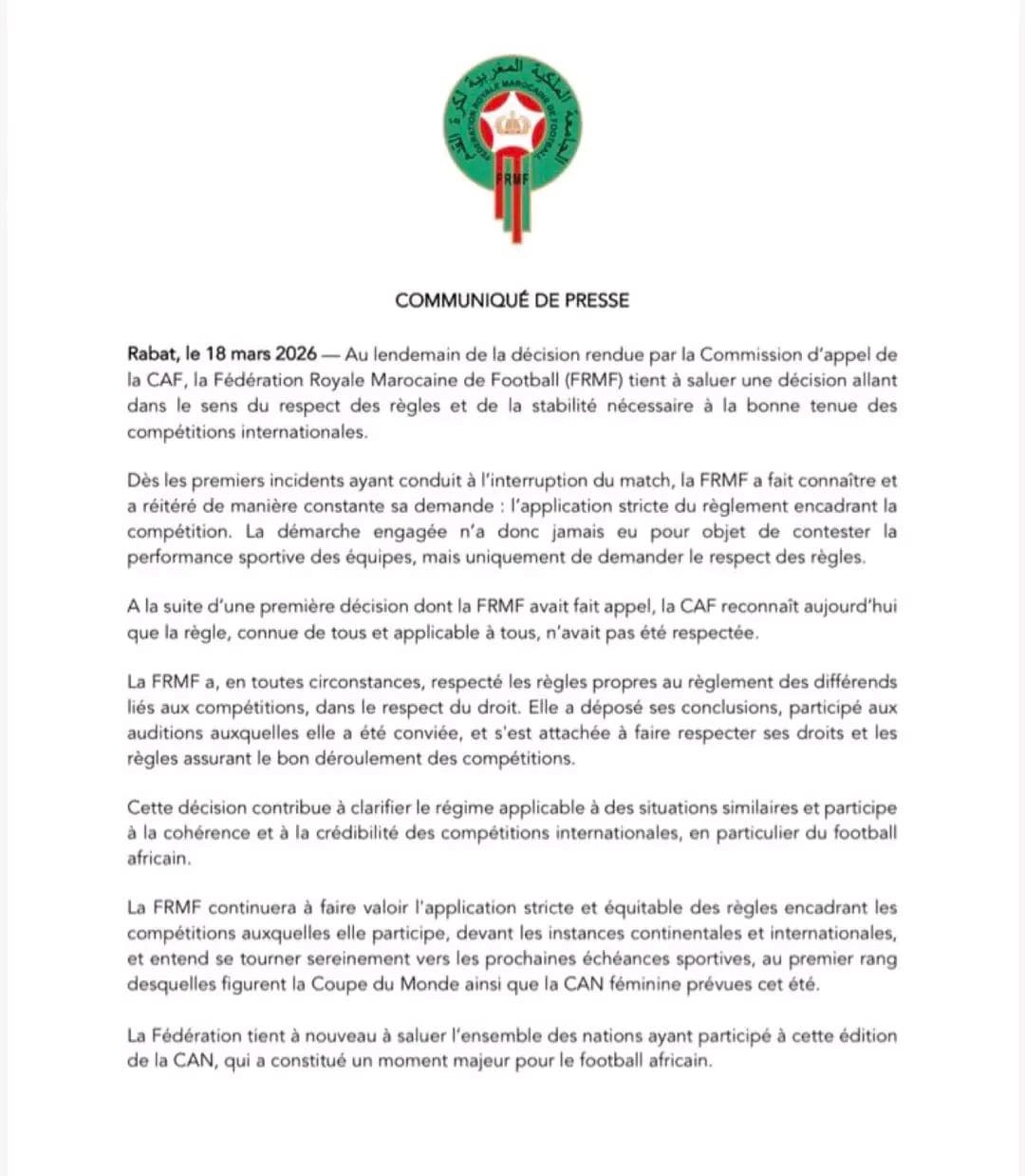 أكدت الجامعة الملكية المغربية، في بيانها أن القرار الصادر عن لجنة الاستئناف يسير في اتجاه تكريس احترام القواعد المنظمة للمسابقة، ويضمن حسن سير المنافسات الدولية.