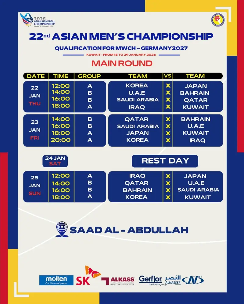 جدول مواعيد مباريات كأس آسيا لكرة اليد اليوم الجمعة 23 يناير 2026 والقنوات الناقلة