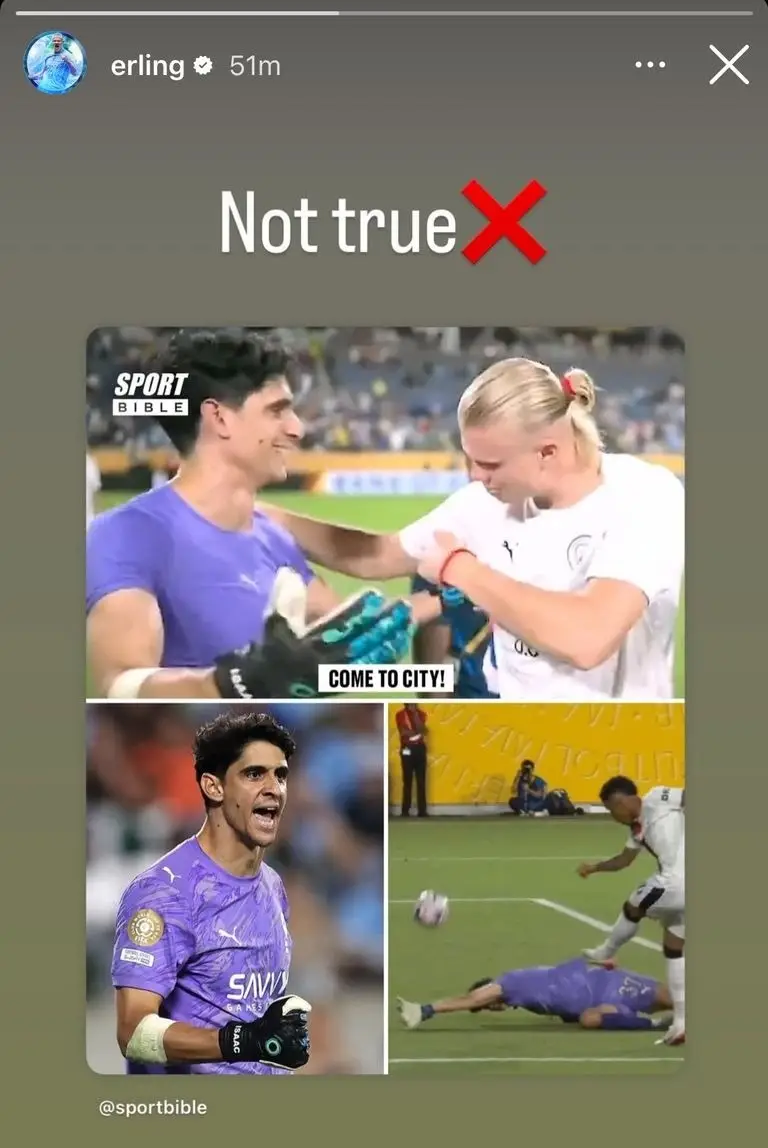 إلا أن هالاند سارع إلى استخدام حسابه الرسمي على موقع التواصل الاجتماعي "إنستغرام" لنفي هذه المزاعم بشكل قاطع. وقام مهاجم السيتي بإعادة نشر صورة من تقرير نشره موقع "سبورت بايبل" الإنجليزي حول الواقعة المتداولة، وأرفقها بتعليق مقتضب باللغة العربية جاء فيه "غير حقيقي"، ليضع حدًا للتكهنات التي أثيرت حول هذا الأمر.