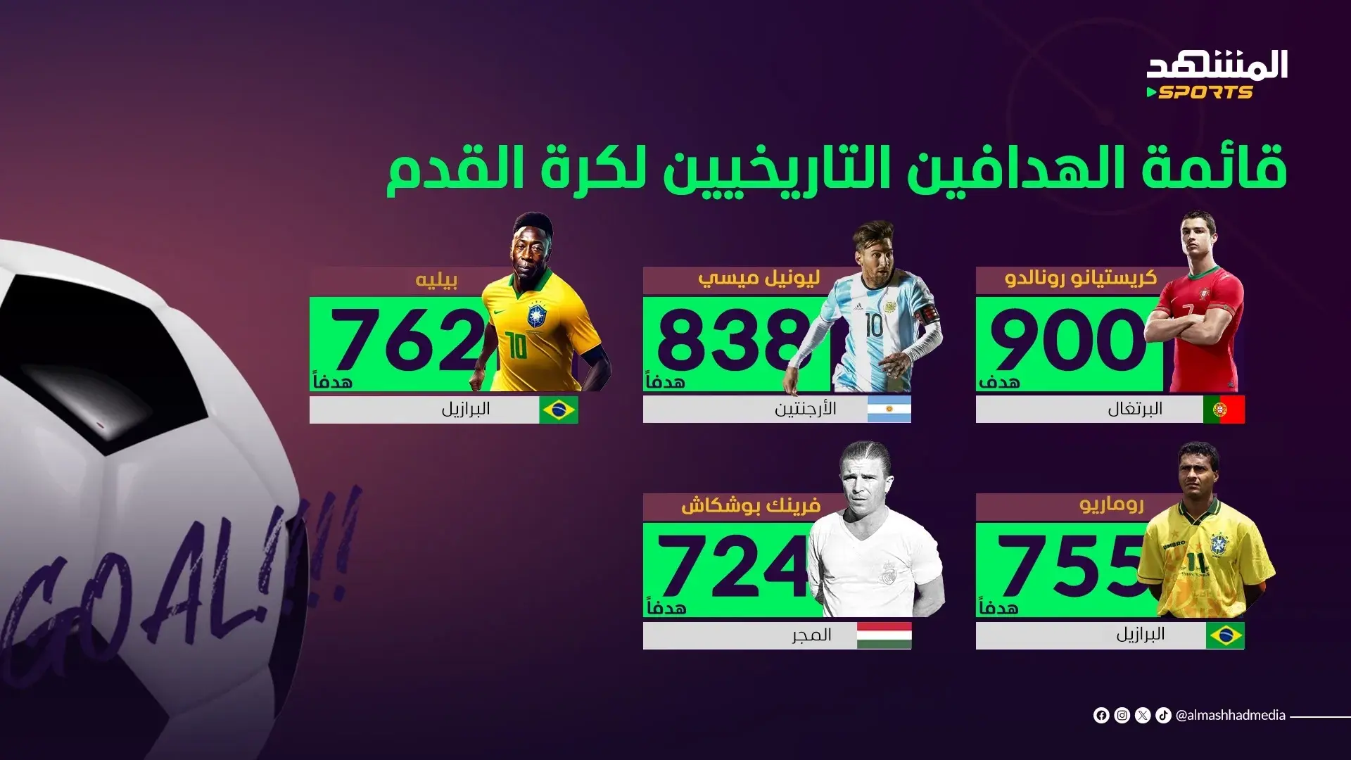 يواصل نجم كرة القدم البرتغالي كريستيانو رونالدو تحطيم الأرقام القياسية التهديفية في رياضة كرة القدم، حيث عزّز رصيده كهداف تاريخي لمنتخب بلاده، ووصل إلى خط نهاية جديدة، هو مُجرد خط لبداية رحلة تهديفية جديدة لا تتوقف، رغم بلوغه عام الـ39، وهو ما يدفعنا لنستعرض ترتيب هدافي كرة القدم عبر التاريخ.