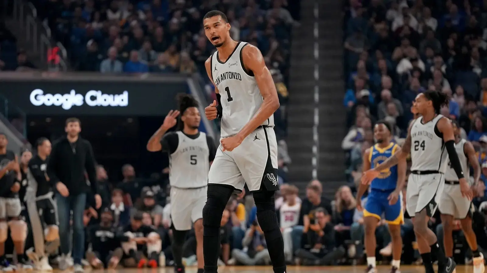 وتقدم سبيرز طوال المباراة التي أقيمت في سان فرانسيسكو حيث أنهى الشوط الـ1 متقدمًا بـ70 مقابل 49، بعدما سجل ويمبانياما 27 نقطة و13 متابعة ليحقق دابل-دابل مبكّرًا.