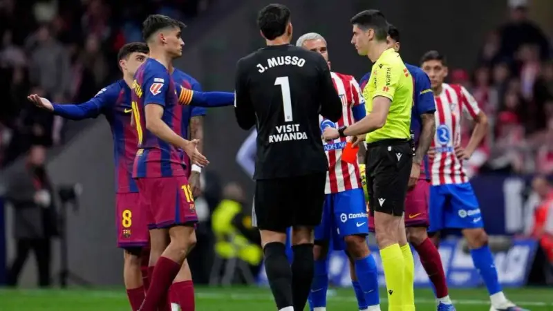 وشهدت المباراة، التي انتهت بفوز برشلونة 2-1، لحظة حاسمة في الشوط الثاني عندما أشهر الحكم الإسباني ماتيو بوسكيتس فيرير البطاقة الحمراء في البداية لمارتن بعد تدخل قوي على ألمادا، قبل أن يظهر تدخل غرفة الـVAR ويحوّل الطرد المباشر إلى بطاقة صفراء فقط، ما سمح للاعب البارسا بالبقاء في الملعب، وهو ما أثار ردود فعل متباينة بين جماهير الأتلتيكو والخبراء.