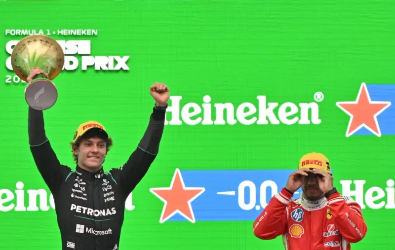 احتفل الشاب الإيطالي كيمي أنتونيلي، البالغ من العمر 19 عامًا، بأول فوز في مسيرته ببطولة العالم للفورمولا 1 بعد أن خطف الصدارة منذ البداية وتقدم على زميله جورج راسل، ليمنح فريق مرسيدس ثنائية ساحقة في جائزة الصين الكبرى الأحد، بينما صعد لويس هاميلتون إلى منصة التتويج للمرة الأولى منذ انضمامه إلى فيراري.