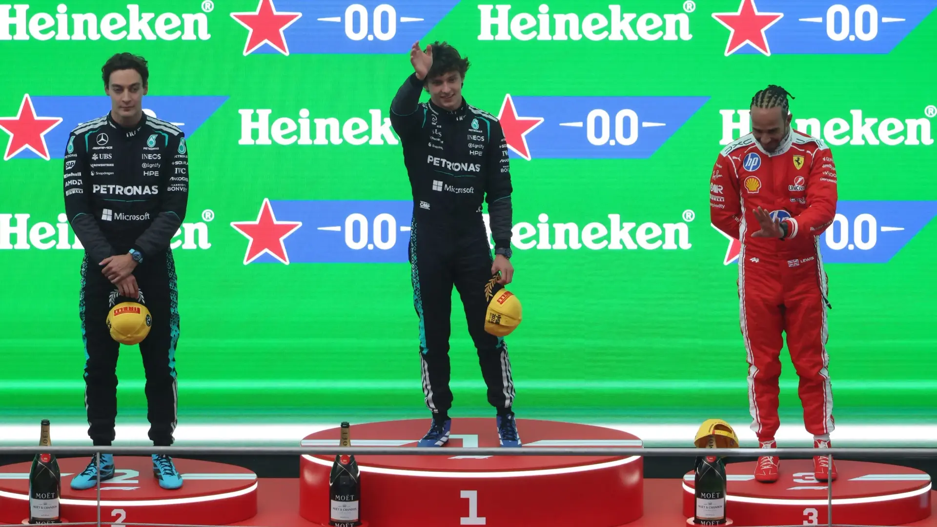 احتفل الشاب الإيطالي كيمي أنتونيلي، البالغ من العمر 19 عامًا، بأول فوز في مسيرته ببطولة العالم للفورمولا 1 بعد أن خطف الصدارة منذ البداية وتقدم على زميله جورج راسل، ليمنح فريق مرسيدس ثنائية ساحقة في جائزة الصين الكبرى الأحد، بينما صعد لويس هاميلتون إلى منصة التتويج للمرة الأولى منذ انضمامه إلى فيراري.