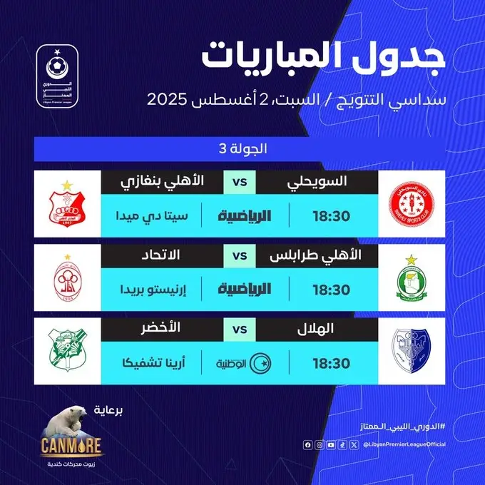 | السويحلي × الأهلي بنغازي | 3 أغسطس 2025 | 17:30 | 18:30 | 19:30 | ليبيا الرياضية |