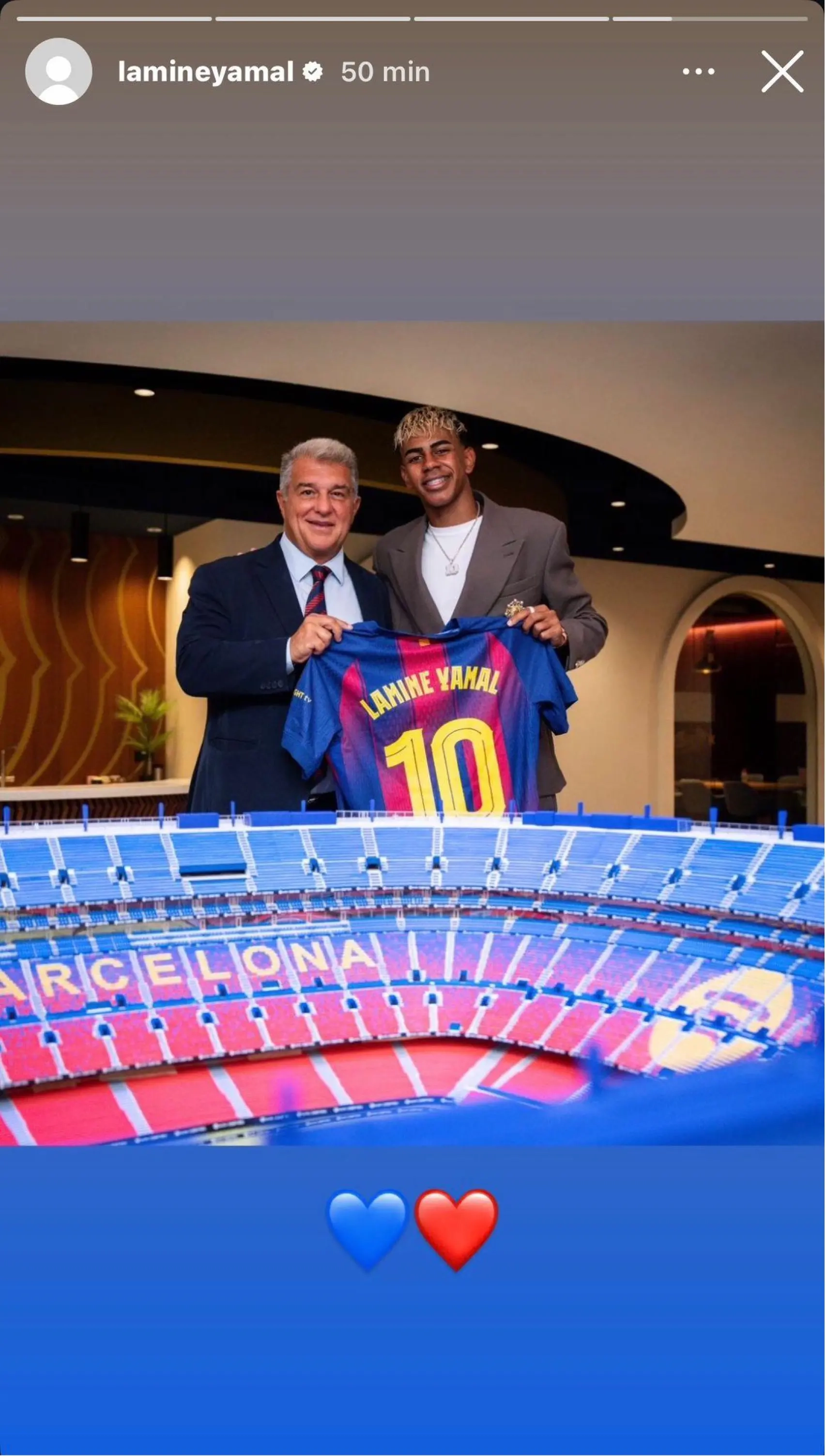 وظهر في الصورة وهو يحمل القميص رقم 10 إلى جانب لابورتا، مرفقة بقلبين باللونين الأحمر والأزرق، في إشارة اعتبرها كثيرون رسالة دعم واضحة للرئيس الحالي.