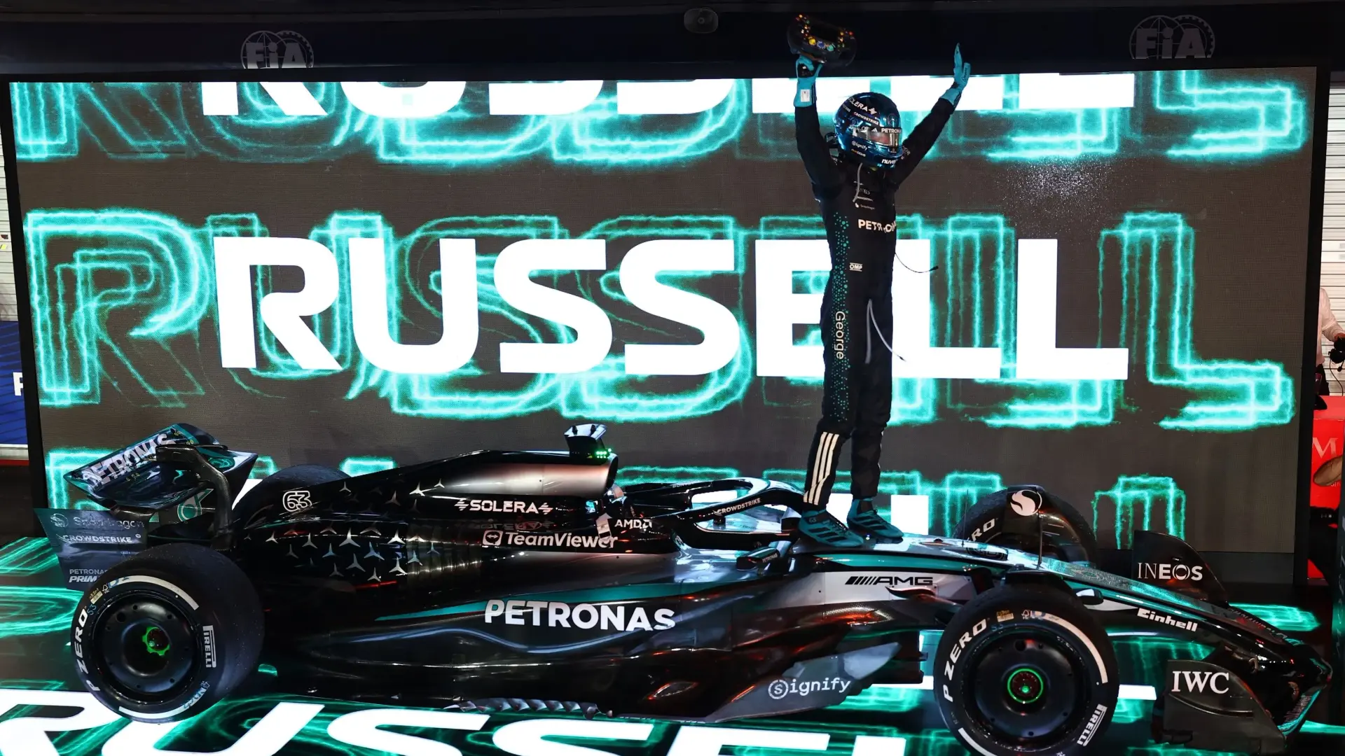 وأحرز فريق مرسيدس بقيادة مديره النمسوي توتو وولف ثمانية ألقاب متتالية لبطولة الصانعين وسبعة ألقاب للسائقين بين 2014 و2021، لكن منذ انضمام راسل في 2022، عانى الفريق للحاق بركب ريد بول وماكلارين.