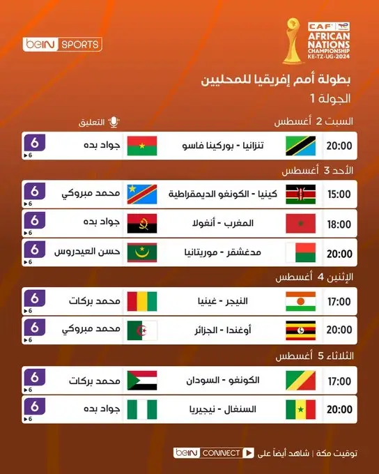 تنقل كافة مباريات اليوم على قناة "بي ان سبورت 6" والتابعة لقنوات بي ان سبورت القطرية، الحاصلة على حقوق تغطية مباريات كأس أمم إفريقيا للمحليين بموسمه الجاري في البلاد العربية ودول الشرق الأوسط.