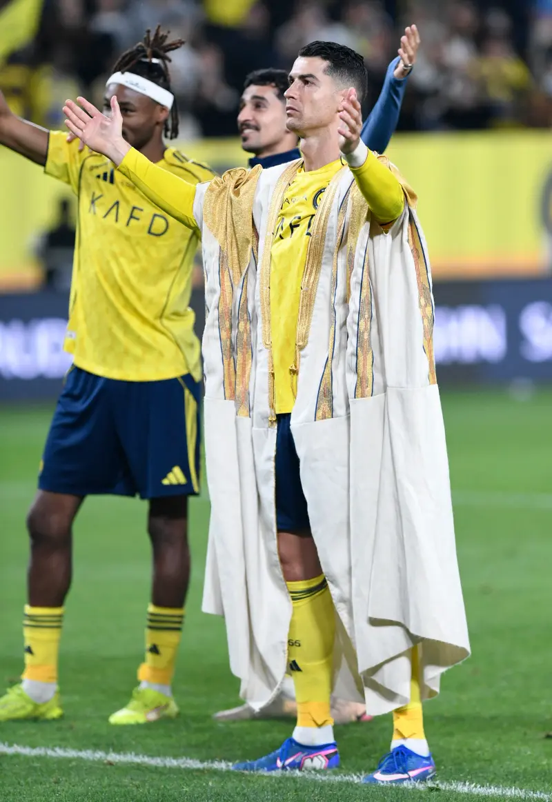 في مشهد لافت، خطف النجم البرتغالي كريستيانو رونالدو الأنظار مجددا، بعدما ارتدى البشت السعودي خلال احتفالات فريقه النصر بالفوز على الحزم وتصدر دوري روشن، تزامنا مع "جولة التأسيس" التي تحتفي بذكرى قيام الدولة السعودية الأولى.