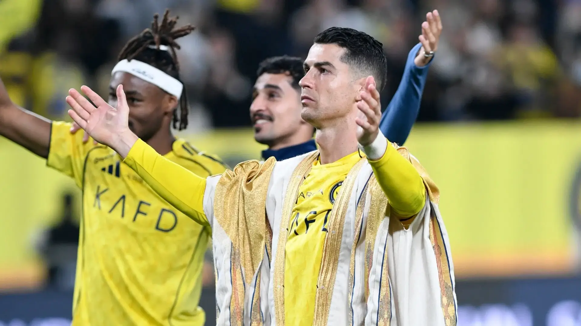 في مشهد لافت، خطف النجم البرتغالي كريستيانو رونالدو الأنظار مجددا، بعدما ارتدى البشت السعودي خلال احتفالات فريقه النصر بالفوز على الحزم وتصدر دوري روشن، تزامنا مع "جولة التأسيس" التي تحتفي بذكرى قيام الدولة السعودية الأولى.