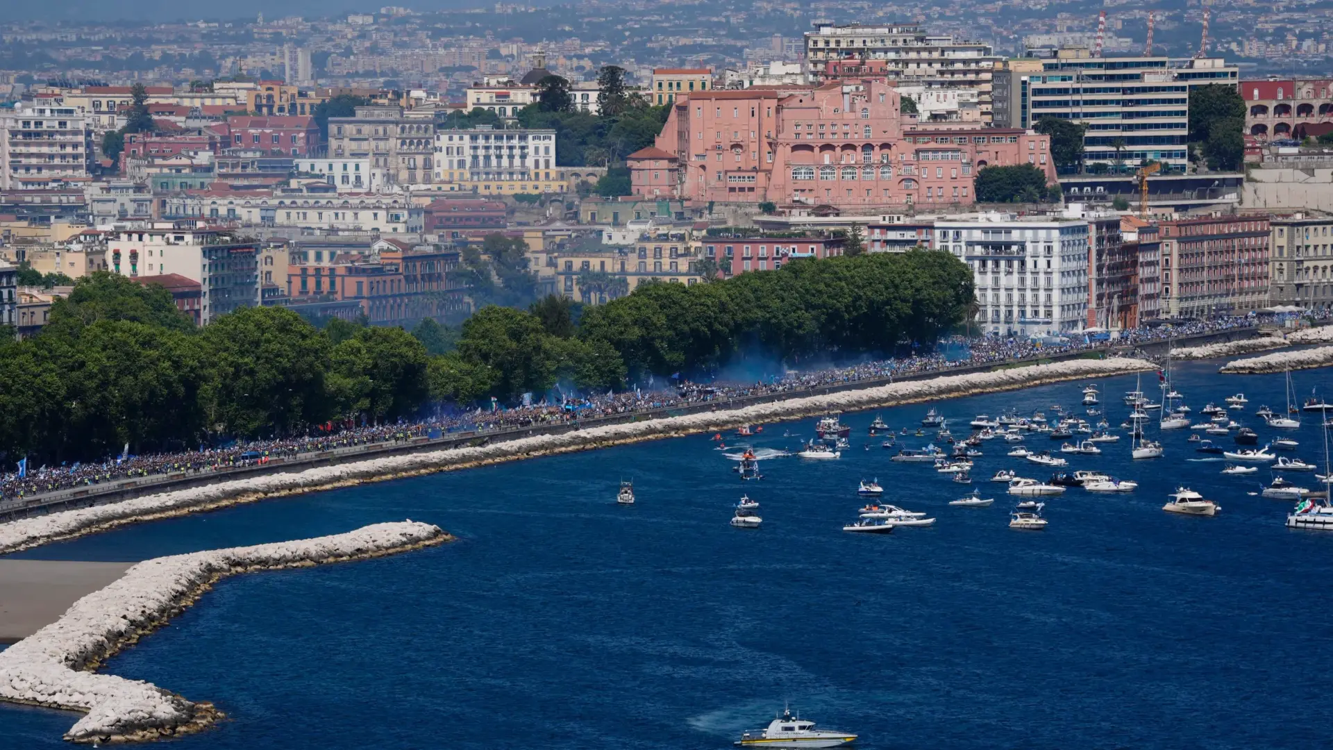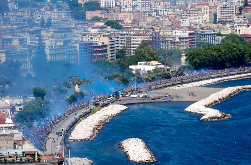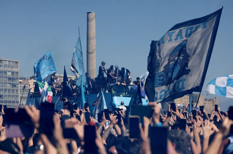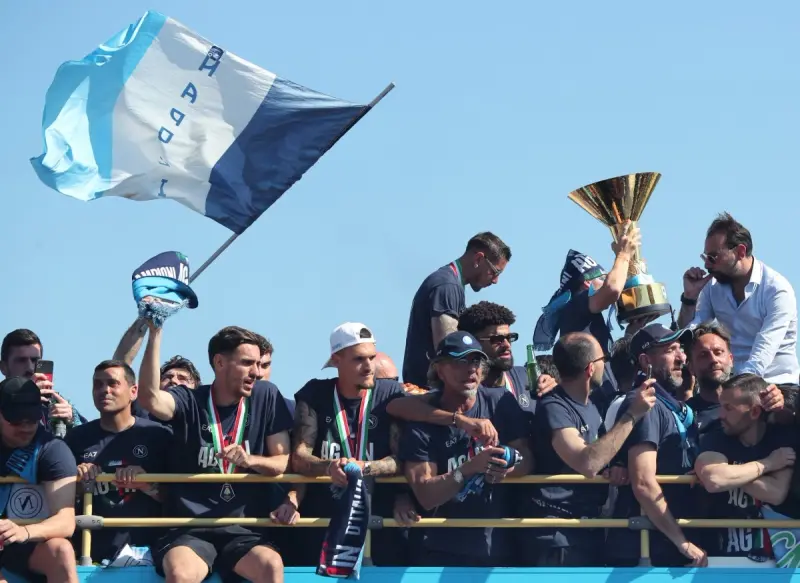 وانطلقت الاحتفالات من ميناء المدينة، حيث وصلت سفينة خاصة تقل اللاعبين وكأس البطولة، قبل أن يصعد الفريق إلى حافلتين مكشوفتين جابتا نابولي في مسار احتفالي طويل، تخلله تفاعل هستيري من الجماهير، وعودة لاحقة إلى السفينة لمواصلة السهرة.