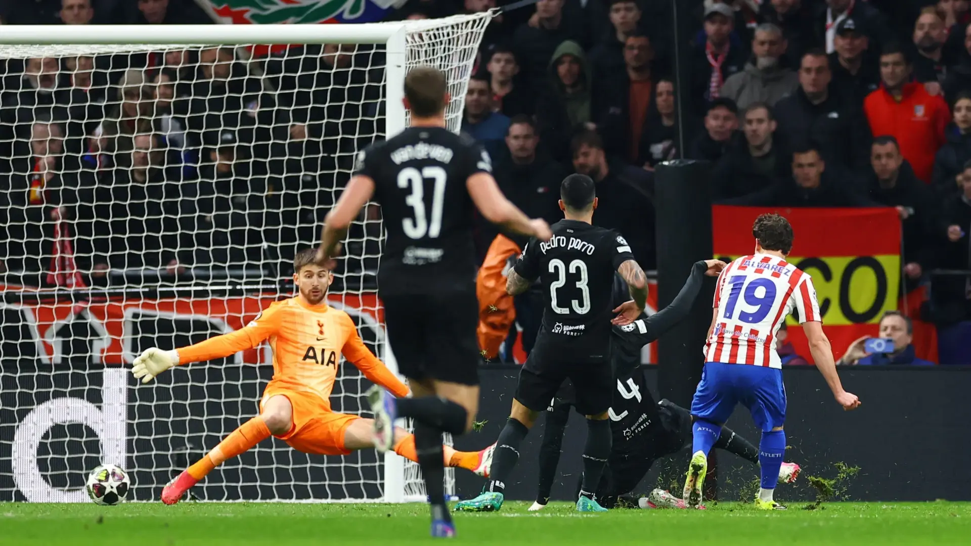 وواصل أتلتيكو مدريد سيطرته خلال الشوط الأول، حيث أضاف روبن لو نورماند الهدف الرابع في الدقيقة 22، فيما حاول توتنهام تقليص الفارق عبر بيدرو بورو الذي سجل هدفًا في الدقيقة 26، ليبقي على آمال فريقه قائمة رغم صعوبة المهمة.
