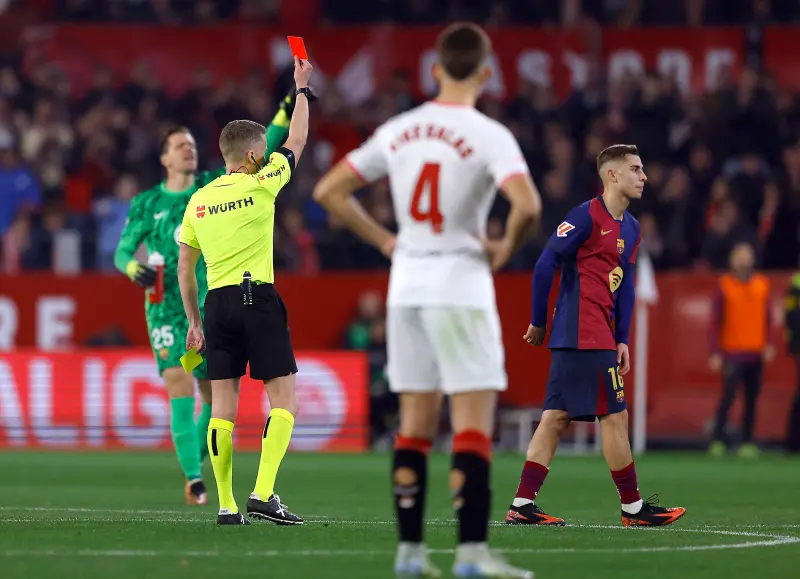 ورغم التفوق الواضح، تعرض برشلونة لضربة قوية بعد طرد فيرمين لوبيز في الدقيقة 62 عقب مراجعة تقنية الفيديو، ليصبح ثاني لاعب بديل في تاريخ برشلونة يسجل ويُطرد في نفس المباراة بالدوري الإسباني خلال القرن الـ21، بعد فيتور روكي أمام ديبورتيفو ألافيس في فبراير من العام الماضي.