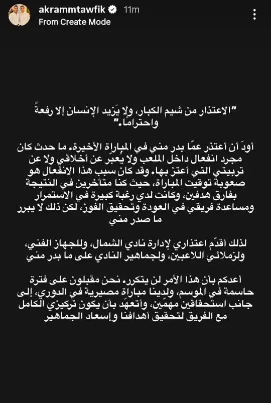 أثار أكرم توفيق تفاعلًا واسعًا بعد نشره عبر حسابه الشخصي قرار لجنة الانضباط في الاتحاد القطري لكرة القدم، والذي قضى باعتماد خسارة نادي قطر أمام نادي الشمال بنتيجة 3-0، في واقعة أثارت الكثير من الجدل داخل الأوساط الكروية.