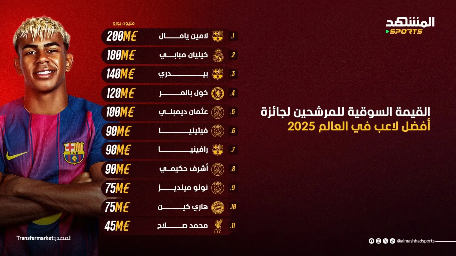 وفقًا لتقديرات موقع "ترانسفير ماركت" المتخصص في تقييم أسعار اللاعبين، جاءت القيمة السوقية الإجمالية للمرشحين لجائزة أفضل لاعب في العالم لعام 2025 على النحو التالي: