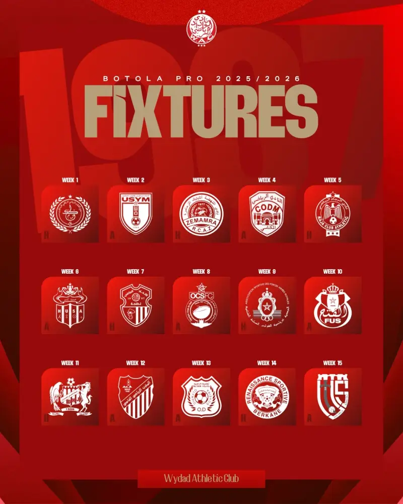 جدول مواعيد مباريات الوداد الرياضي في الدوري المغربي 2025-2026