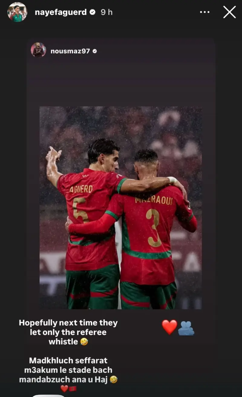 لإغلاق باب التأويلات، نشر مزراوي صورة تجمعه بأكرد عبر خاصية "الستوري" على حسابه الرسمي في "إنستغرام"، قبل أن يعيد أكرد نشرها مع تعليق ساخر قال فيه: “نأمل في المرة القادمة أن يُسمح فقط للحكم بإطلاق الصافرة.. لا تُدخلوا معكم الصفارات للملعب حتى لا نتشاجر أنا (والحاج).”
