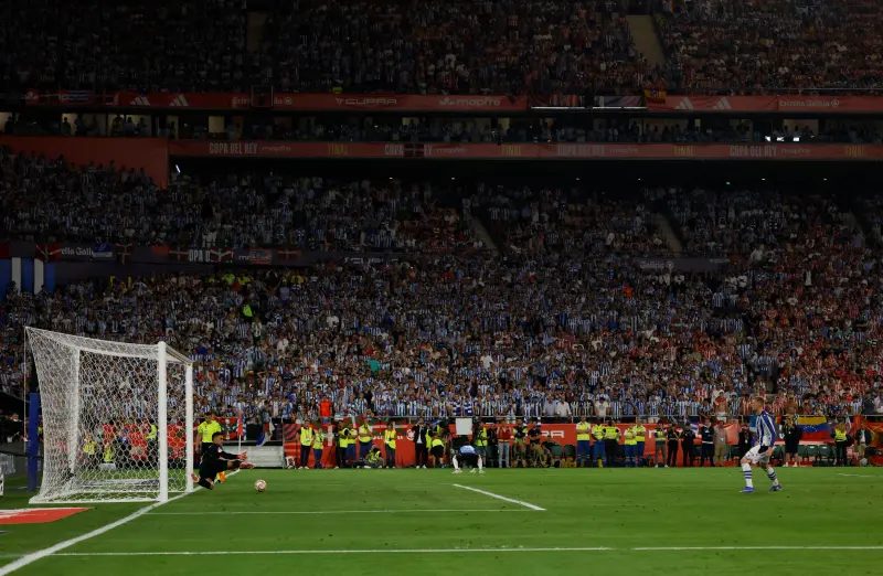 تألق أوناي ماريرو بشكل لافت في ركلات الترجيح وتصدى لركلتي جزاء حاسمتين أمام ألكسندر سورلوث وجوليان ألفاريز، مانحًا تفوقًا معنويًا لريال سوسيداد الذي تفوق بنتيجة 4-3 في النهاية بفضل تصدياته الحاسمة.