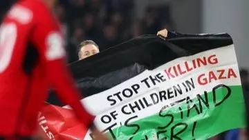 ووضع المشجع عبارة على العلم "أوقفوا قتل الأطفال في غزة" وعبارة أخرى "لنتحد جميعا سويا".