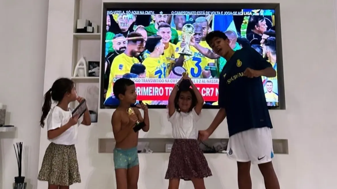 ونقلت جورجينا صورة حيّة عن الاحتفالات التي أقامها أطفال رونالدو الـ4، كريستيانو جونيور، والتوأم تياغو وإيفا، والطفلة آلانا مارتينا، يقفون أمام شاشة تلفزيون كانت تنقل مراسم تتويج رونالدو رفقة باقي نجوم نادي النصر.