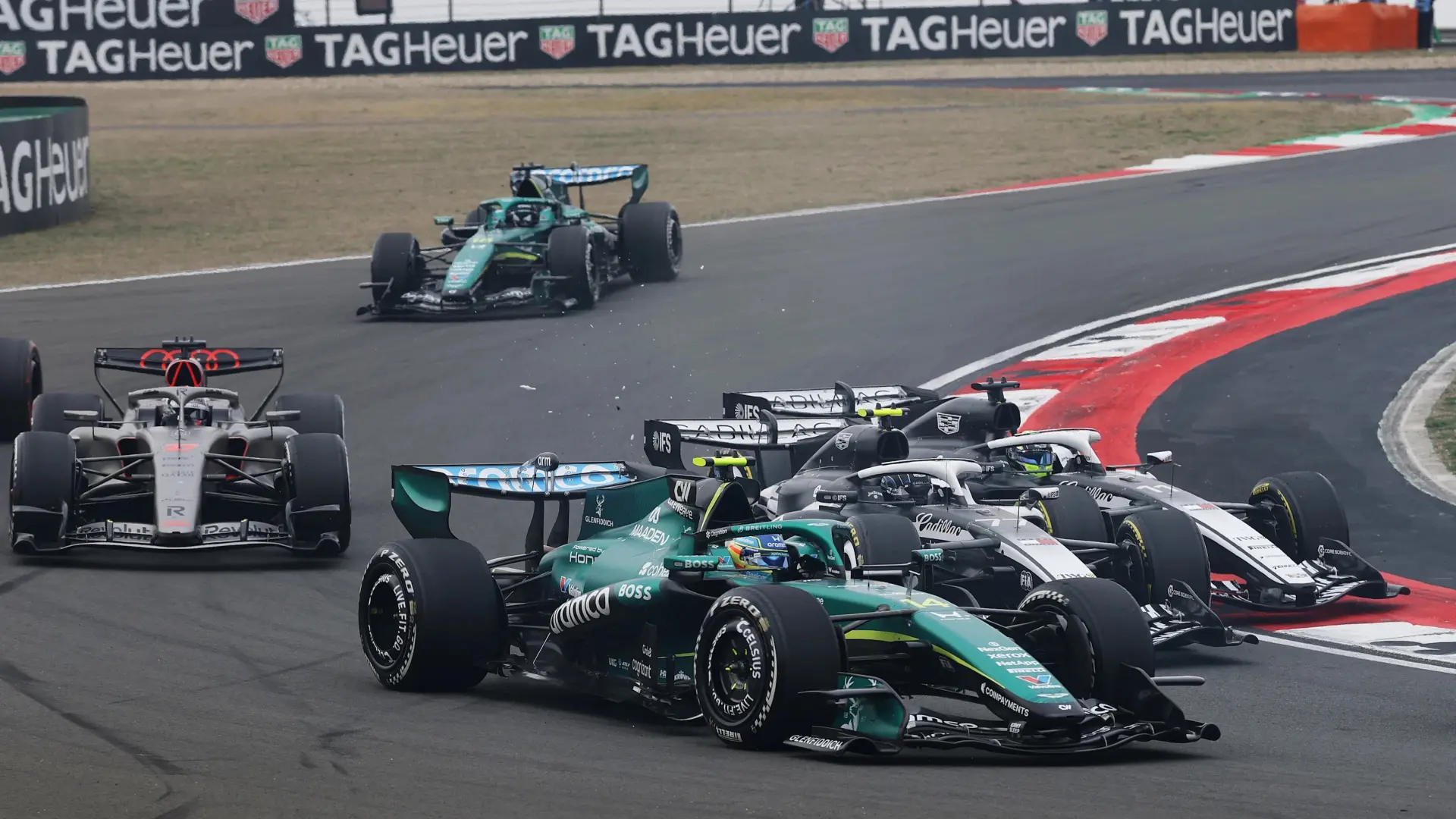 وحاول السائق المكسيكي التجاوز من الجهة الداخلية لسيارة بوتاس عند مدخل المنعطف، في الوقت الذي كانت فيه سيارة أستون مارتن الخاصة بالسائق فرناندو ألونسو توجد في الجهة الخارجية. ووجد بيريز نفسه فوق المطبات الجانبية، ليلامس بإطاره الأمامي الأيمن الجانب الأيسر لسيارة زميله الفنلندي، ما أدى إلى التفافه حول نفسه وإلحاق أضرار بسيارة زميله في الفريق.