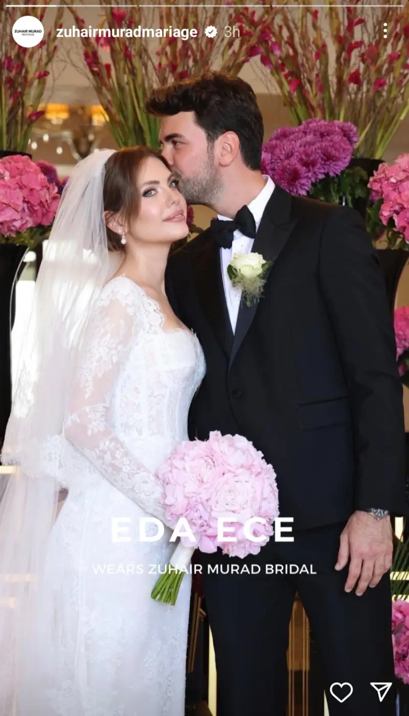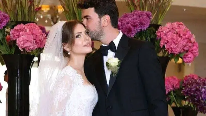 ولفتت الممثلة التركية الأنظار بإطلالتها الراقية والناعمة التي زيّنتها بمجوهرات من "تيفاني أند كو"، ووضعت طرحة طويلة وحملت باقة ورود باللون الزهري الفاتح.