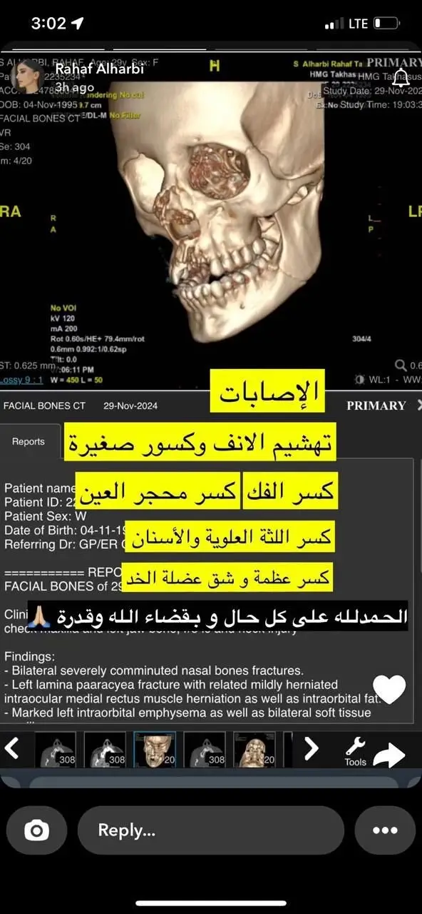 علقت الحربي على صورة الأشعة المعروضة قائلة: "الإصابات تهشيم الأنف وكسور صغيرة، كسر الفك ومحجر العين، كسر اللثة العلوية والأسنان، كسر عظمة وشق عضلة الخد"، متابعة: "الحمد لله على كل شيء، قدر الله وما شاء فعل"