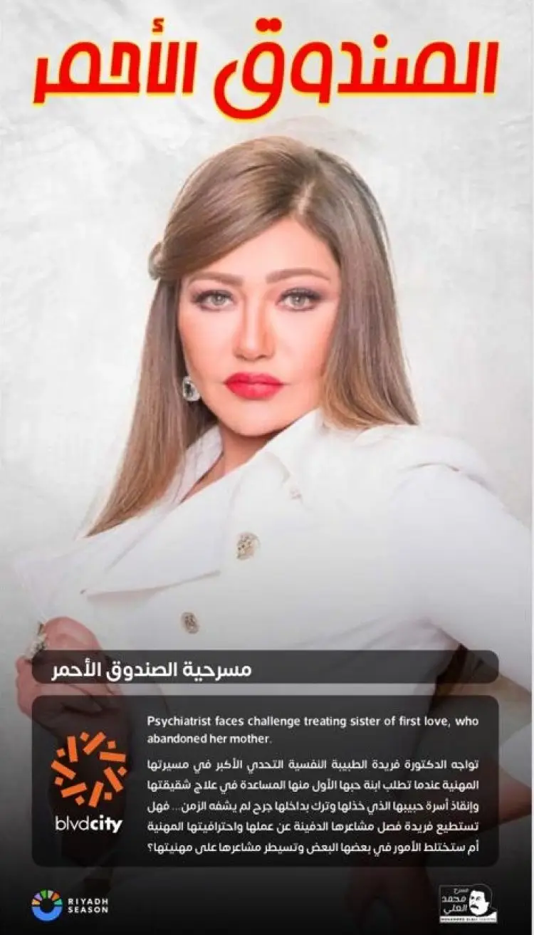 يلتقي الجمهور السعودي، بالفنانة ليلى علوي في مسرحية الصندوق الأحمر، حيث تدور أحداثها حول الطبيبة النفسية "فريدة" التي تواجه واحد من أكبر التحديات في مسيرتها المهنية، وتطلب ابنة حبها الأول مساعدتها في علاج شقيقتها.