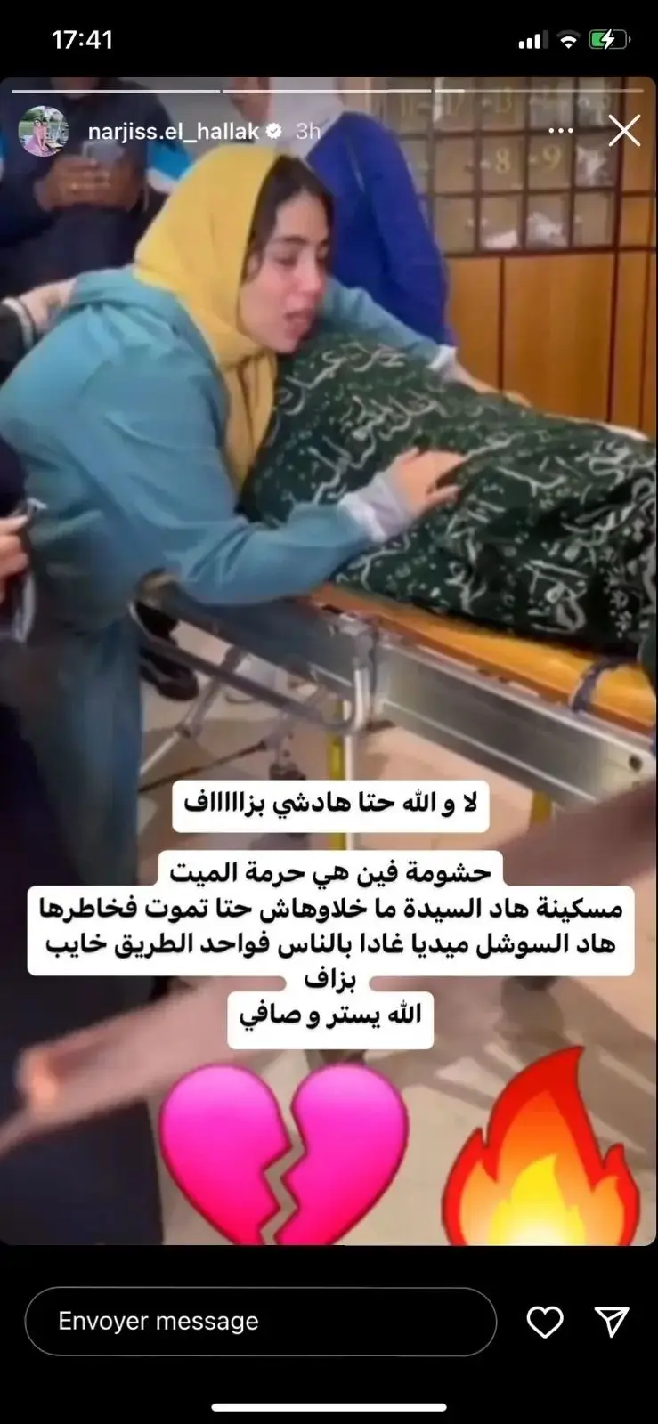 وعبر خاصية "الستوري" على حسابها الرسميّ على موقع تبادل الصور والفيديوهات، شنت نرجس الحلاق الفنانة المغربية هجومًا على ابنة التيك توكر مي السعدية وكتبت: "هذا الأمر غريب ولم يعد يحتمل، لأنّ حرمة الميت فقدت الاحترام، ولم يتركوها تموت على راحتها، والعالم الافتراضي أصبح طريقه مخيفًا، اللهم سترك".