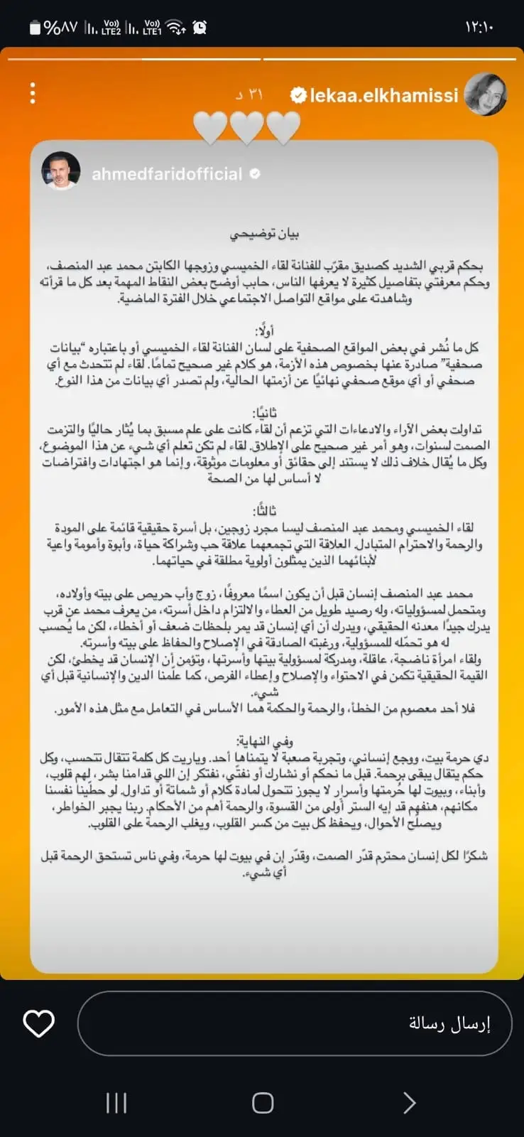 شاركت الفنانة لقاء الخميسي عبر خاصية الاستوري على حسابها الرسمي على منصة "إنستغرام" بياناً توضيحياً من صديق العائلة الفنان أحمد فريد بخصوص الأزمة الأخيرة.