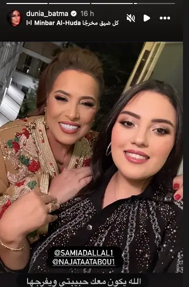 وتضامنت الفنانة المغربية دنيا بطمة مع نجاة اعتابو، وواستها في محنة الأسرة الأخيرة، حيث نشرت صورة للفنانة المغربية مع ابنتها وعلقت عليها قائلة: "الله يكون معك حبيبتي ويفرجها عليكي.. قلبي معك".