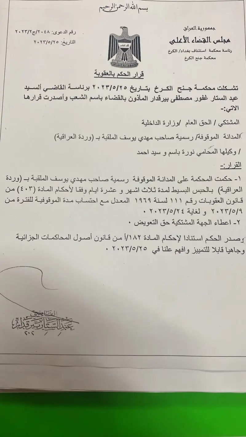لذلك تم القبض على وردة، الأسبوع الماضي، لمدة 3 أشهر بتهمة خدش الحياء وتقديم محتوى هابط، وذكرت الوثيقة القضائية، أنّ المدانة الموقوفة "رسمية صاحب مهدي يوسف" الملقبة بـ"وردة العراقية"، تم الحكم عليها بالحبس لمدة 3 أشهر و10 أيام وفقًا لأحكام المادة 403 من قانون العقوبات رقم 111 لسنة 1999 المعدل، مع احتساب مدة الموقوفية للفترة من 9 مايو 2023 لـ 24 مايو 2023.