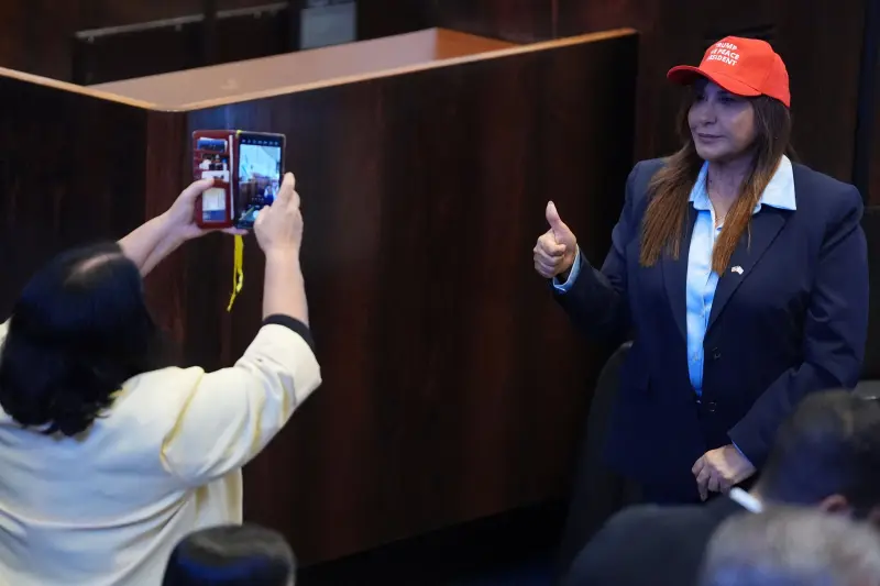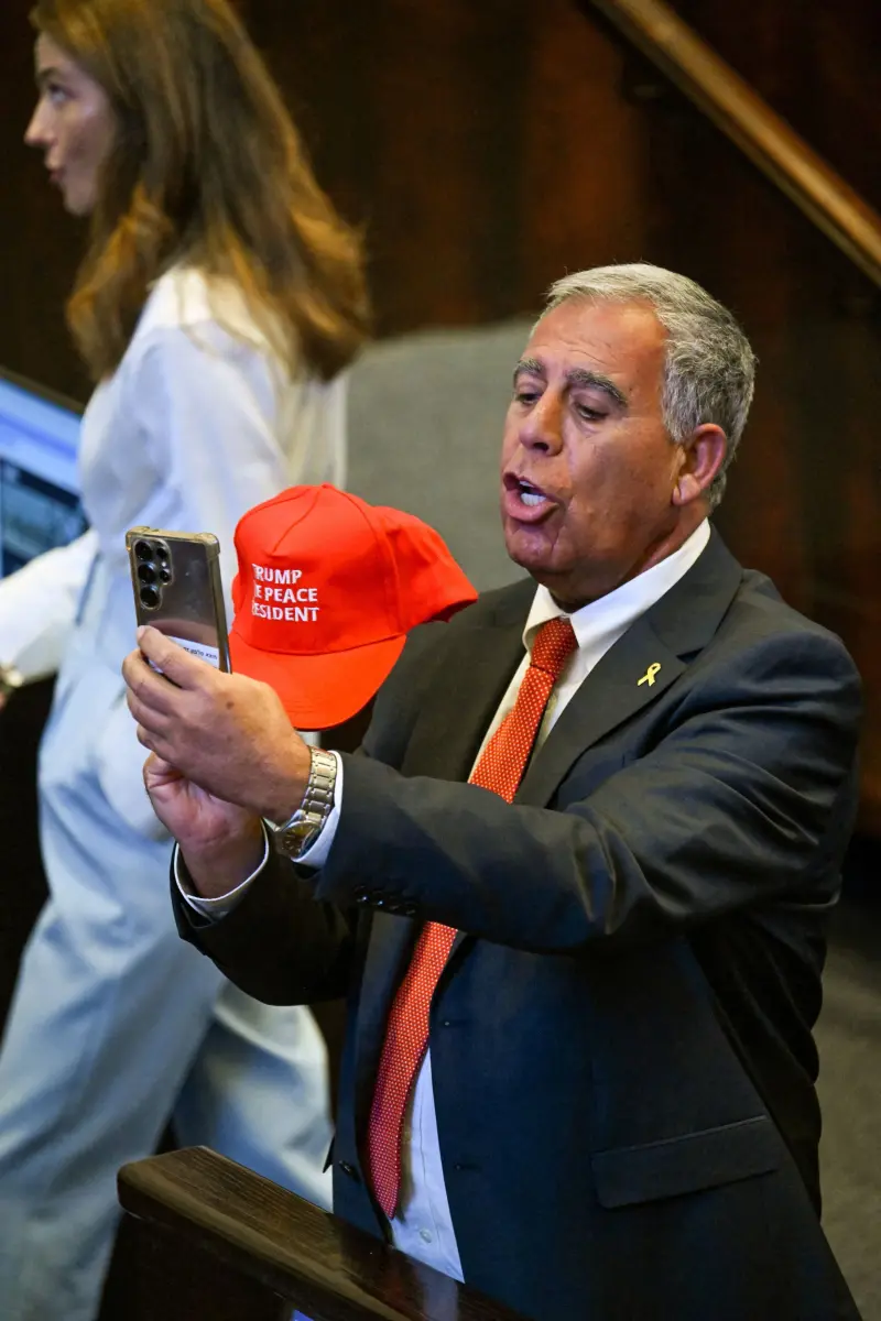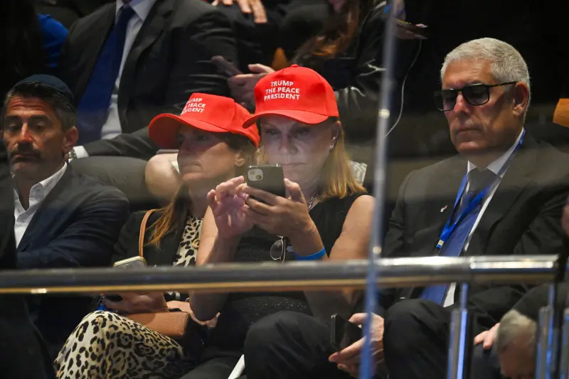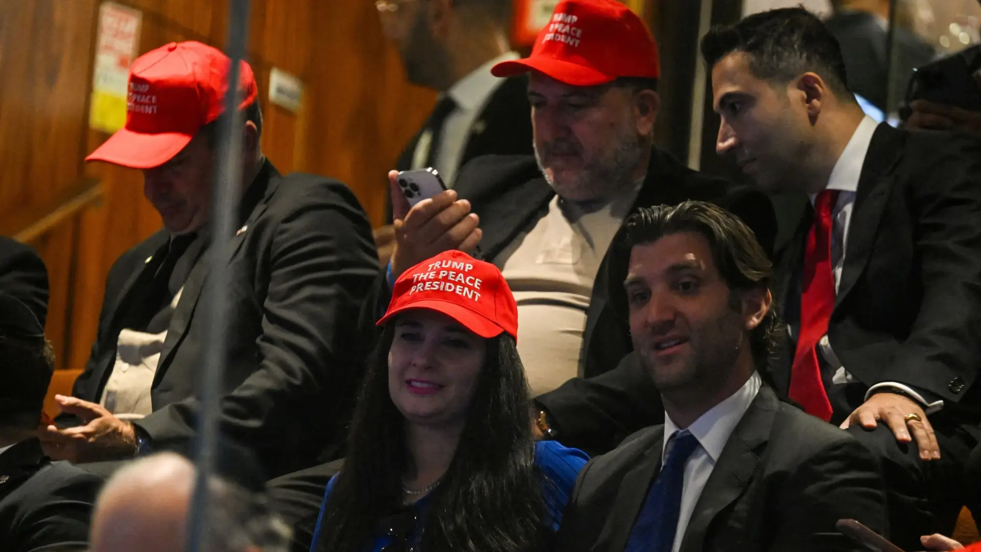 ووزع موظفو الكنيست الإسرائيلي على النواب، قبيل خطاب الرئيس الأميركي قبعات حمراء مستوحاة من قبعات MAGA، وكتب عليها "ترامب رئيس السلام".
