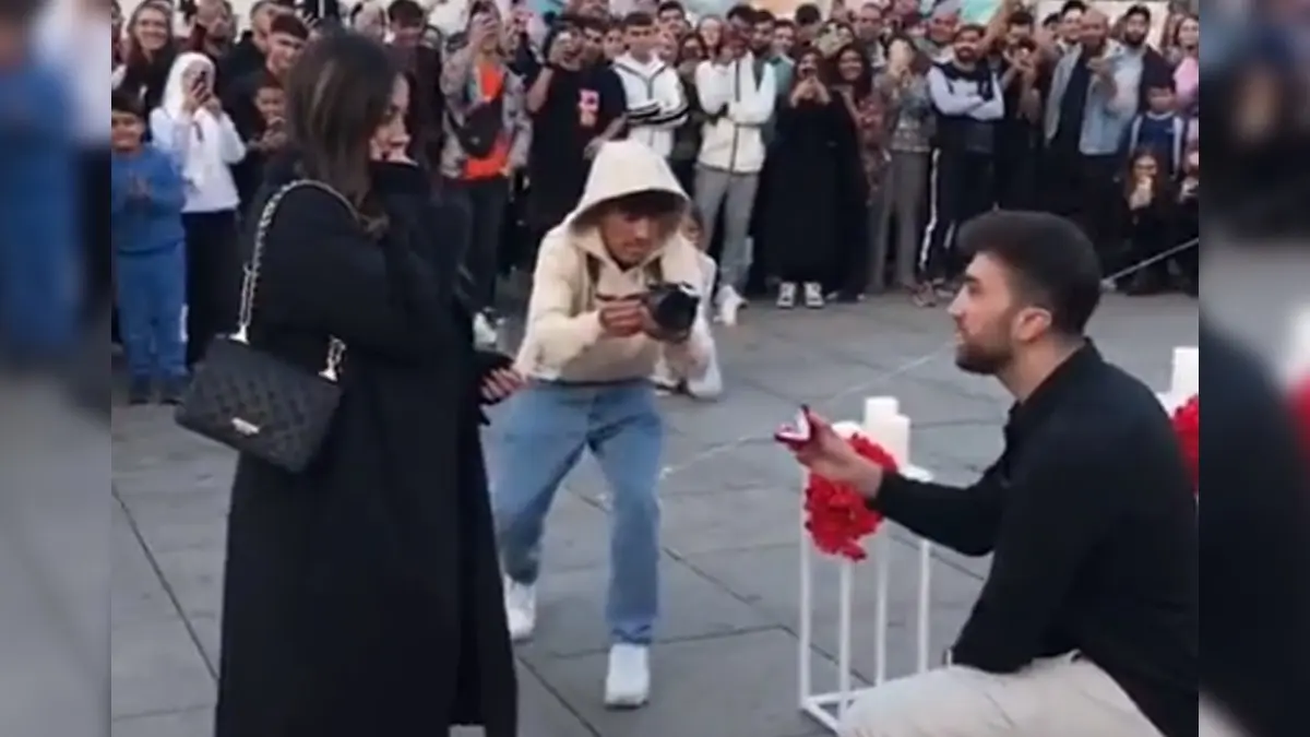 انتشر على مواقع التواصل الاجتماعي فيديو صادم ومثير للجدل لشاب قرّر أن يعرض الزواج على صديقته في مكان عام بحضور حشد كبير جدا من الناس، إلا أنه لم يتوّقع في الحقيقة ردّ فعل صديقته التي تفاجأت بالطلب وانسحبت من دون أن توافق على عرض الزواج.