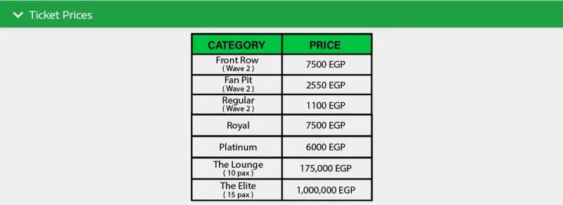 بدأت عملية طرح التذاكر بأسعار متفاوتة تناسب شرائح مختلفة من الجمهور، حيث انطلقت الفئة الأولى من 1000 جنيه، قبل أن تشهد ارتفاعًا لاحقًا لتصل إلى 1100 جنيه.