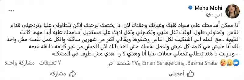 جاء هذا الجدل بعد رسالة غامضة نشرتها مها نصار على حساباتها على مواقع التواصل الاجتماعي، أكدت فيها رفضها لأي محاولة للتقليل من شأنها أو الإساءة لها.