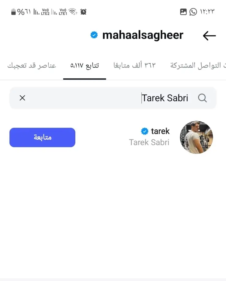 ويظهر الحساب الرسمي للفنان طارق صبري عبر منصة "إنستغرام" متابعته للحساب الرسمي للإعلامية مها الصغير طليقة أحمد السقا، كما تتابعه هي أيضاً.